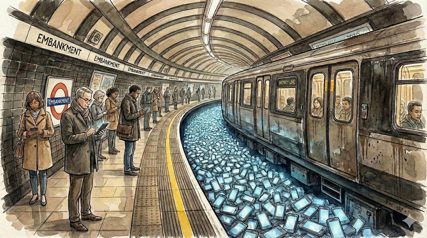 Try something different. Break into the engine room of your phone use and start slowing the iron wheel. Tap into the social commitment power of the commute to enforce a daily habitual intentional break from your phone (fortunately, you don’t have to wear the high vis idiot vest - a simple sticker will do). Get in touch, I’ll send you one.